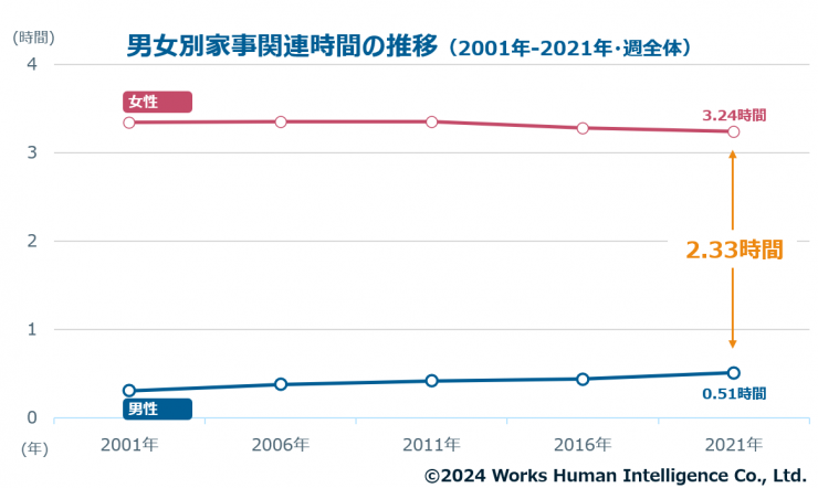 また、総務省統計局「令和3年社会生活基本調査」によると、女性の家事関連時間(家事・育児・介護等)は1日あたり3時間24分と、男性の51分と比べて約4倍長いという結果でした。家事時間の男女差は縮小傾向にあるものの、依然として女性の家事負担が大きいことも背景にあると考えられます。