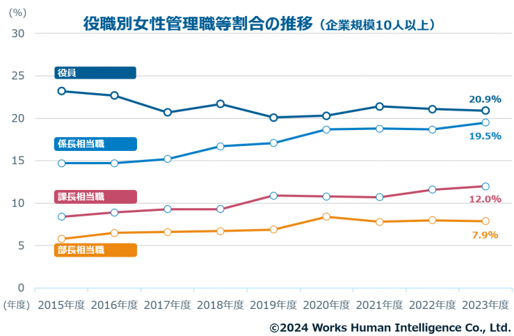 続いて、各役職における女性の割合を見ると、2023年度は課長相当職が12.0%、部長相当職が7.9%、係長相当職が19.5%でした。役員以外では直近10年で緩やかに上昇傾向にあるとはいえ、依然として管理職は男性比率が高い状況が続いています。