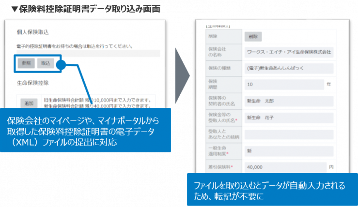 従業員にとっても、保険の種類・受取人・保険料等を申告書に転記または、WEB上で申告システムへぽちぽち入力する必要がなくなり、加入している保険会社から入手したXMLファイルを添付するだけでよくなるため、申告の煩わしさを軽減できます。