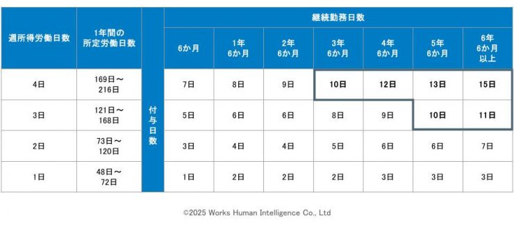 年次有給休暇の付与日数は従業員の所定労働日数に応じて決まり、所定労働日数が少ない従業員(アルバイトやパート等)の場合、フルタイム勤務者に比べて少ない有給休暇が付与されます。そのなかでも、下表の太枠で囲んでいる部分に該当する従業員が、年次有給休暇管理簿の作成対象です。