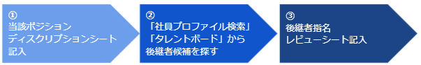 まず、当該ポジションのディスクリプションシートを記入し、次に「社員プロファイル検索」機能もしくは「タレントボード」機能を使って、後継者候補を探します。社員プロファイル検索では、これまでの異動歴や技能資格等の基本情報だけでなく、直近2年間程度の人事考課情報や、TOEIC点数・中国語スキル等も確認(グローバル展開をしているため)します。タレントボードでは自部署の「等級/年代別ポートフォリオ」等を見ています。タレントボードはスタッフの分布や人員構成といった全体感が把握できるため、長期的視点での後継者管理がしやすい点がメリットだと考えています。候補者が決定したら、候補者を第1候補グループ~第3候補グループ へセットし、最後に選択理由と今後の育成計画(レビューシート)を記入して完了です。