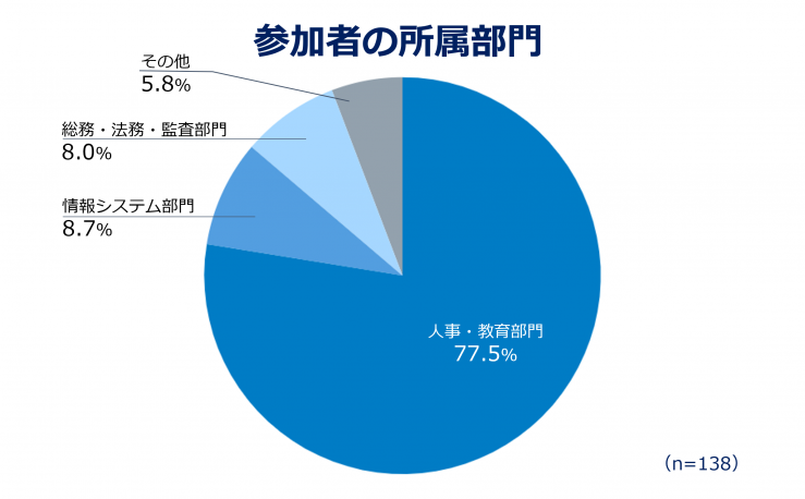 業種別では製造業の参加者が最も多く38%、次いで運輸・情報通信業が15.6%、サービス業が13.9%となりました。従業員規模別では、1,000名~3,000名が最も多く43.5%、3,001名~5,000名が14.7%、5,001名~10,000名が9.3%でした。また、参加者の所属部署は「人事・教育部門」が7割を超え、「情報システム部門」、「総務・法務・監査部門」がそれぞれ8%前後となりました。