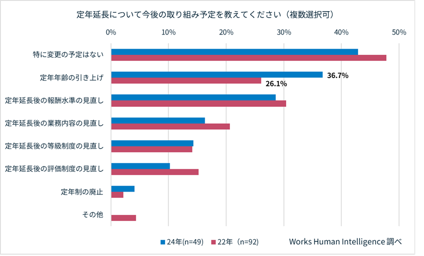 2.定年年齢の引き上げを予定している企業の割合は36.7%で、2022年調査から10.6%増加。人手不足が続く中、経験豊富な従業員の確保が課題となっていることが推察される。