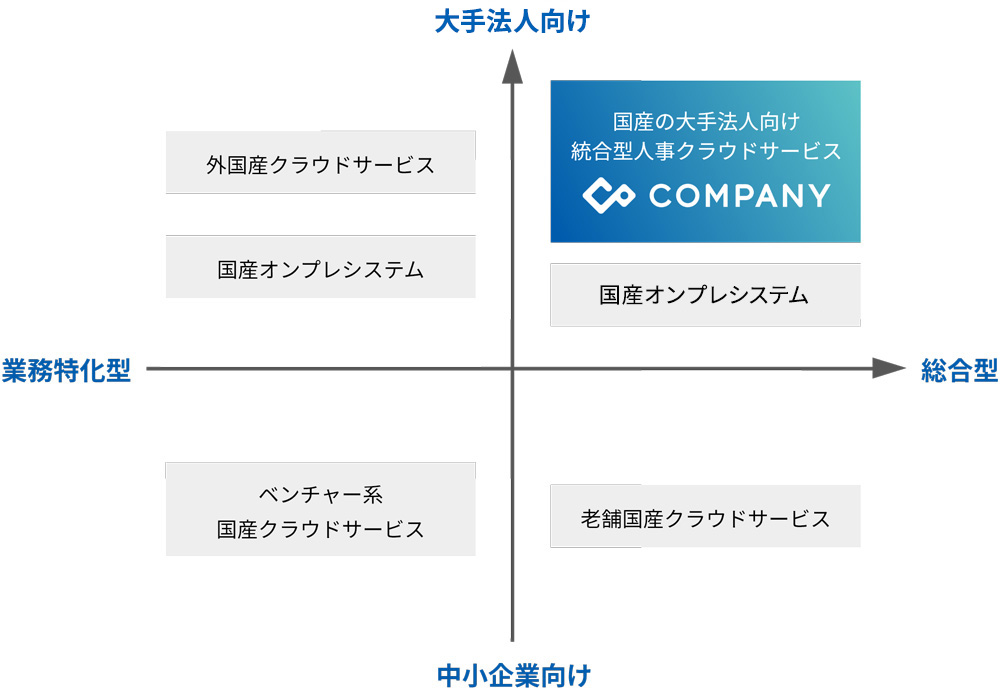 COMPANYは、その中でも特に大手法人様向けに、統合型のソリューションとして提供しています。他にはない豊富な標準機能、高品質なセキュア環境、安心の定額制で、貴社の求める人材戦略を実現します。