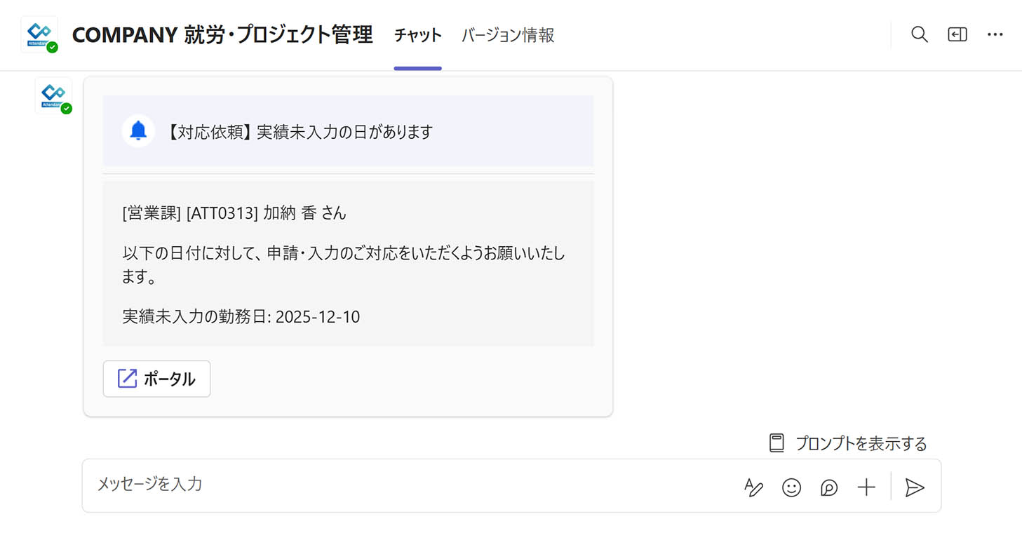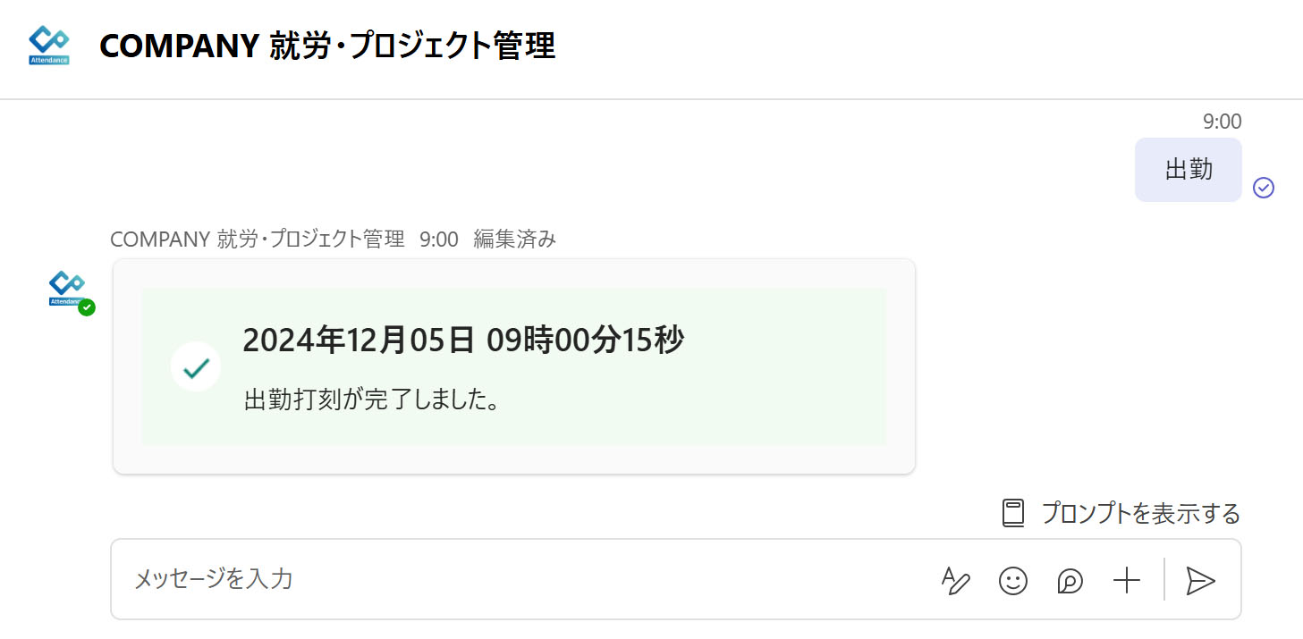 Microsoft Teams のチャットに「出勤」「退勤」「外出」「戻り」と入力することで出退勤や中抜けの打刻が可能。