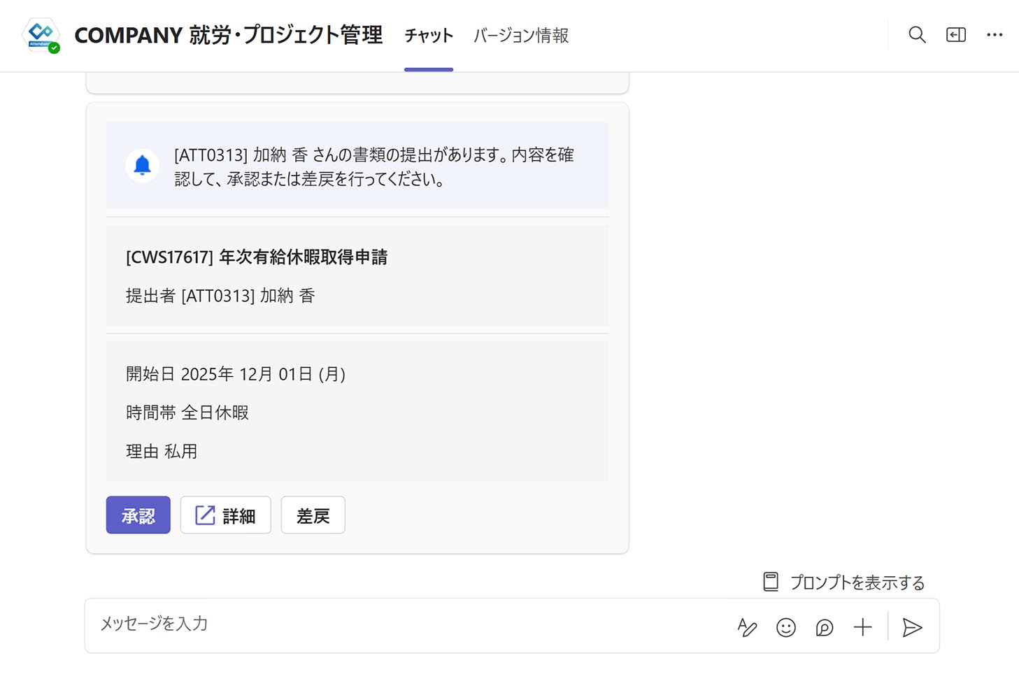 部下から提出された勤務実績や各種休暇取得申請の承認など、上長が処理すべきタスクをMicrosoft Teams 上に通知。