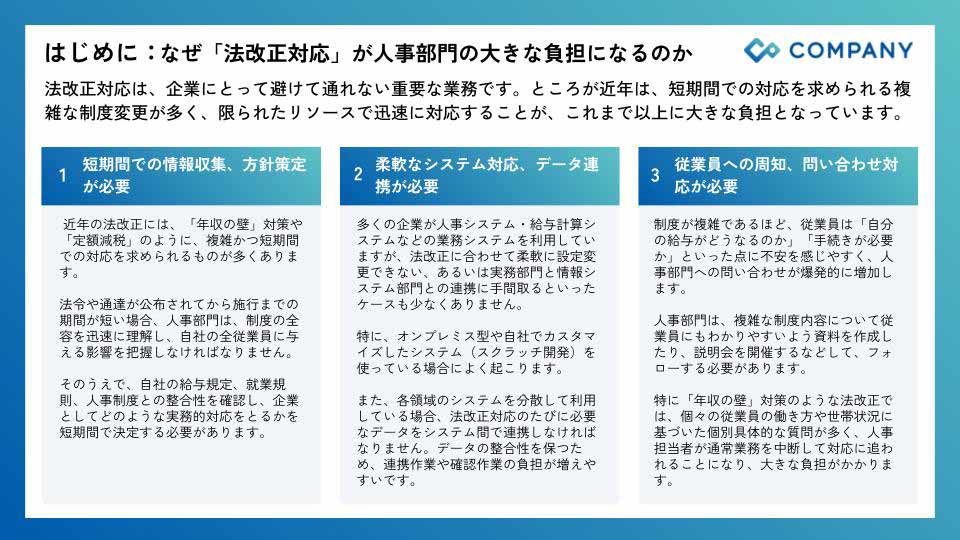 【法改正対応の業務負担を軽減!】 短期間で複雑な対応を求められる法改正について、大手企業が直面する課題を整理。実務で押さえるべきポイントや、システム標準機能の活用による工数削減・改修コスト抑制の具体策をご紹介します。